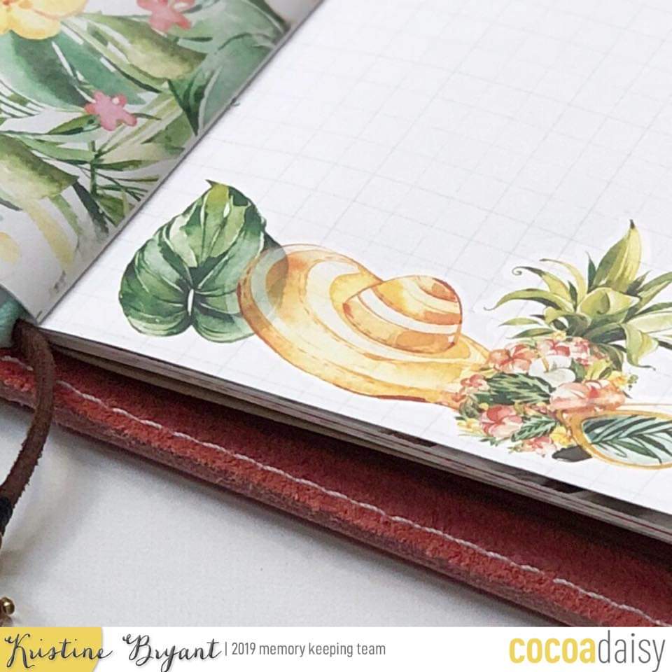 For my second layout, I layered rub-ons across the bottom of one page. There are so many to choose from, and I picked ones that I thought would look nice with the tropical print on the opposite page. The rub-ons have to be one of my favorite things in all the kits – they layer so beautifully and look like they were printed on the page. For this page, I used individual images from both the Pocket MK and TNMK kits.” All I can say is 😍
