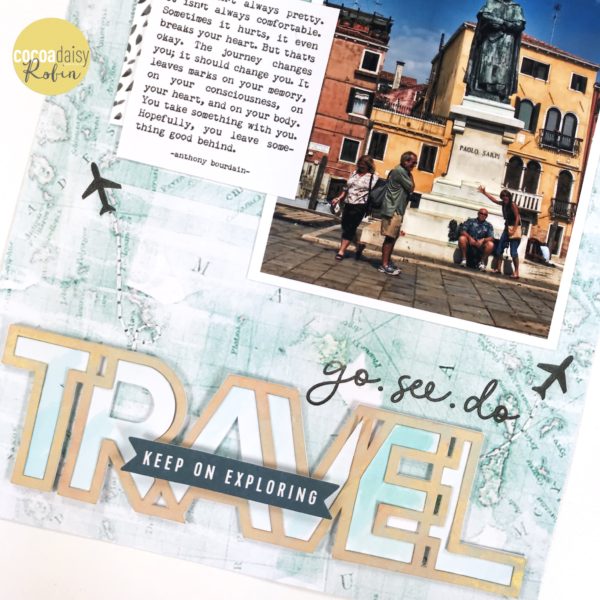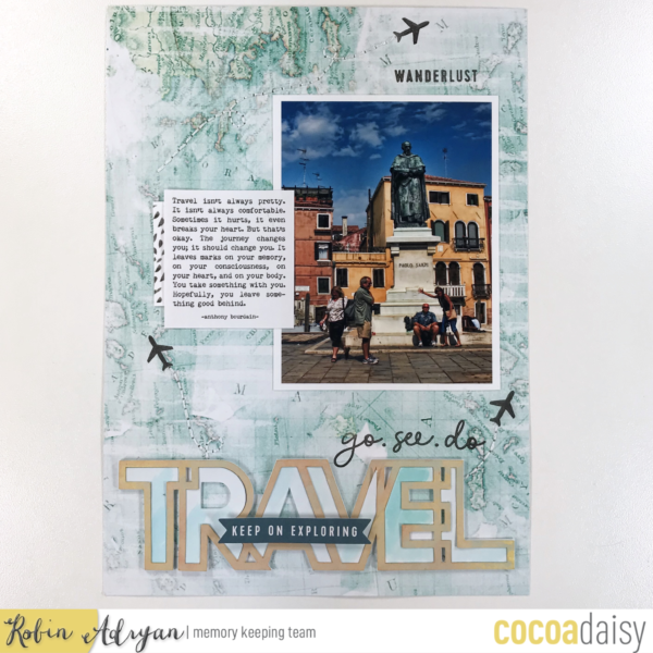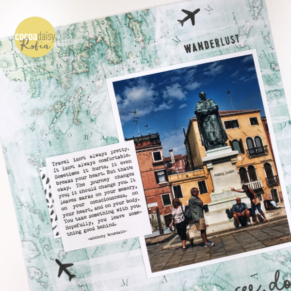 I chose this fun photo taken in Venice, the quote, and stamps from this month’s memory keeping kit. The patterned paper is from the planner kit. I added trails to the airplane stamps with hand stitching.
