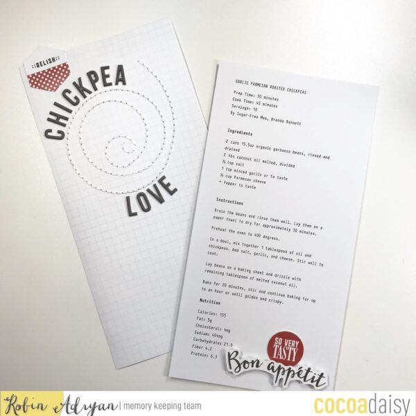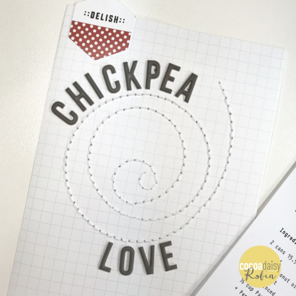 Because I want this album to be brimming with lots of recipes and visually appealing, I decided to add interest and texture with hand stitching, stamps, flat cut files, die cuts, and patterned paper. My roasted chickpea recipe is a simple design that includes a hand stitched spiral and doesn’t require a lot of height space in the album.
