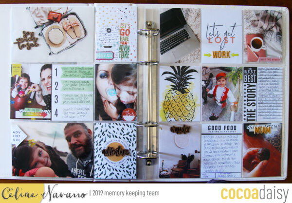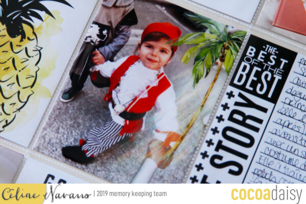 On this page, the B&W contrast is everything that I love! The journaling cards are gorgeous and give so much contrast to my colorful pictures and THAT PINEAPPLE! just love it!