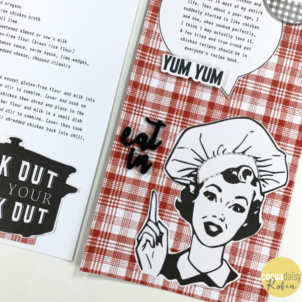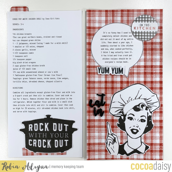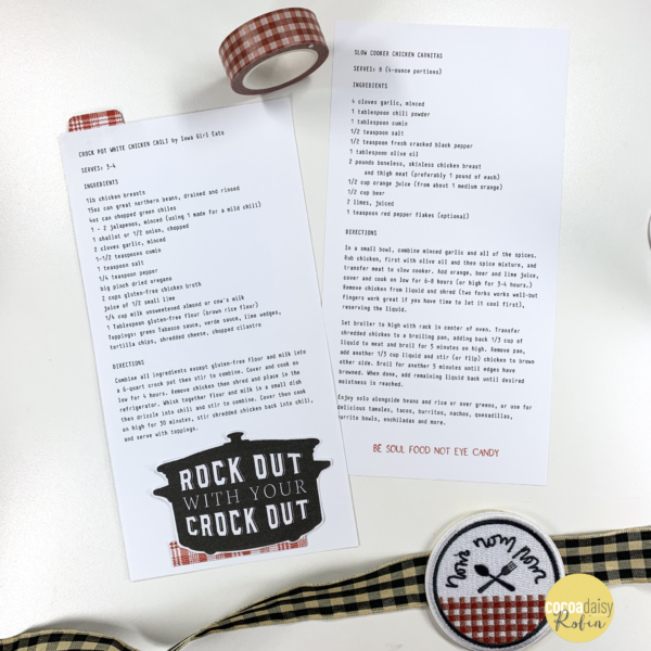 My design holds two crock pot chicken recipes that I love and have made many times. I created a tab from the red plaid paper so that I could use it to pull out the two recipes which are glued together back to back.