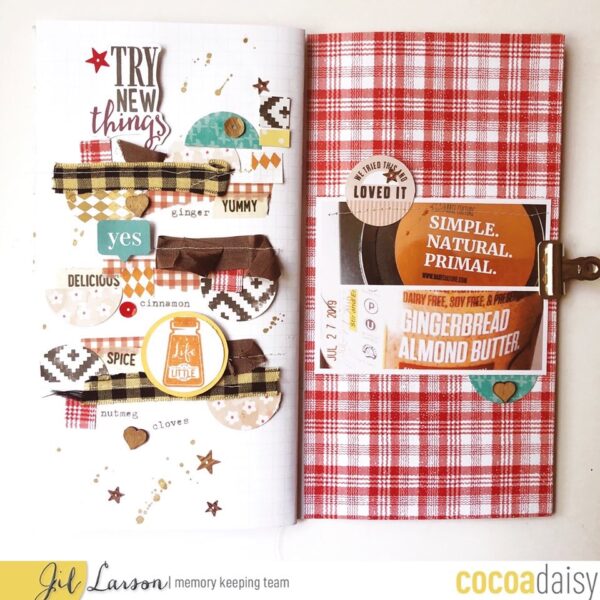 “Here I document the fun of trying new things. Gingerbread Almond Butter sounded great to me because I love ginger and pumpkin-pie spice. Almond butter, it turns out, is amazing with these spices added! I used the gingham washi from the kit, along with the word washi, and I created a little diamond pattern “gingham” with a stamp. The kit ribbon is also a kind of check, so I cut and sewed that to my page along with some brown seam binding. I’m using papers from earlier kits because I wanted a pop of turquoise.”