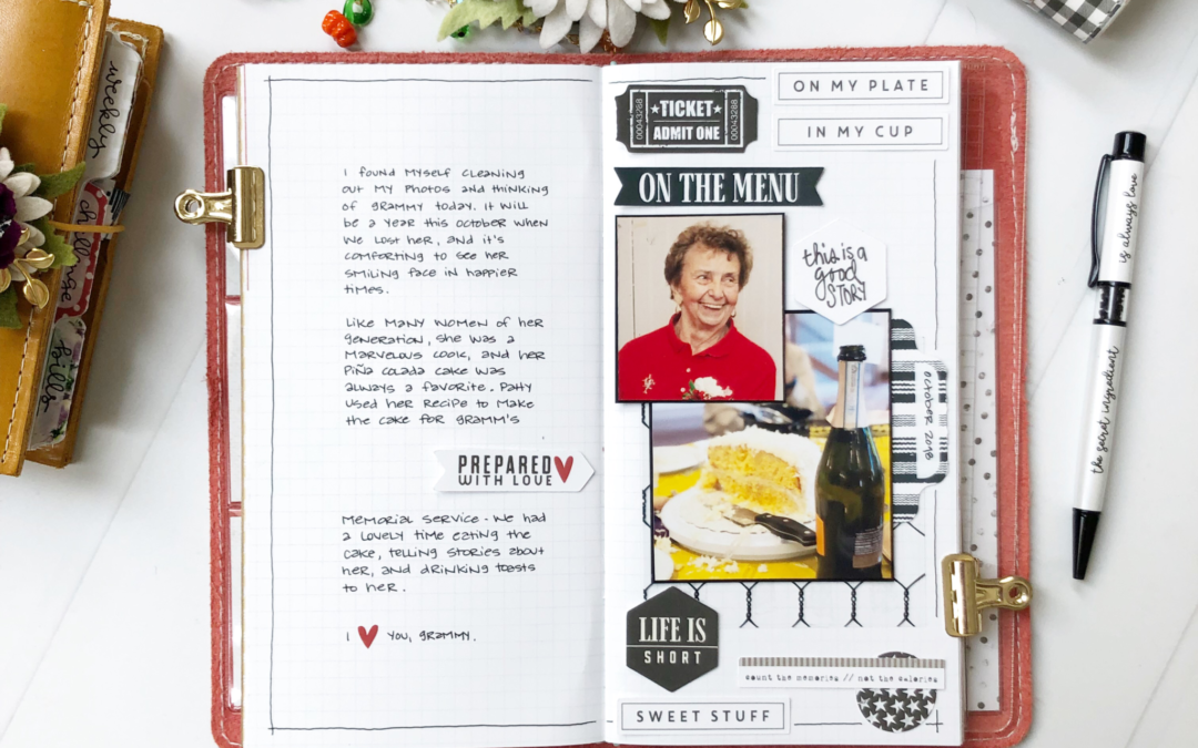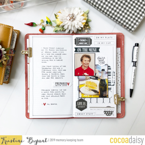 Much like Evelyne, I chose black and white embellishments and journaling to complement the color in the photographs in my spread. I chose a plain grid layout and added black and white die cuts to create a pattern on one side, with some plain journaling on the other to balance it all out. Since the topic of the spread is my grandmother’s cooking, the food and drink theme of the Farmer’s Market kit is just perfect: