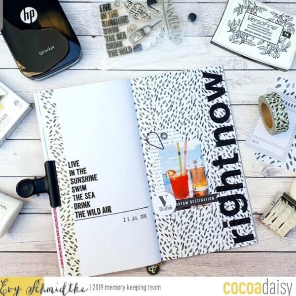 For this project I decided to use only black and white to put the photo in the foreground. Being on vacation I used very few things but sometimes less is better! The left page has a vertical line of washi, a stamp (if I remember the stamp is from last summer) and the date; while the right page has the title stamped (inspired by the sketch of the month of August), a tag and 2 diecuts, I just added a clip!  I really like the final effect because it reminds me of the feeling of serenity I experienced in the photo.