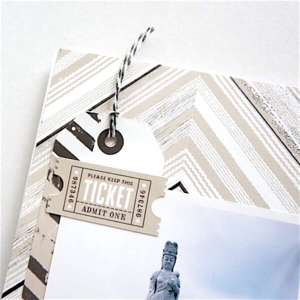 “Here’s a closer look. I looped in a piece of twine through the tag to add some texture.” A truly lovely design by Ria that draws the eye right to the sweet photo.