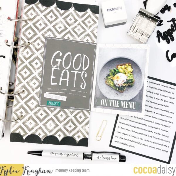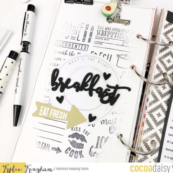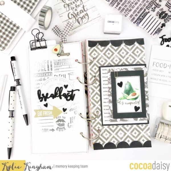 She noted, “I chose a simple black and white monochromatic theme, continuing to work in my August TN. I created a fold out sleeve from some of the Pocket Memory Keeping cards. It folds out to house a photo and I use a paper clip to hold the recipe card in place.”