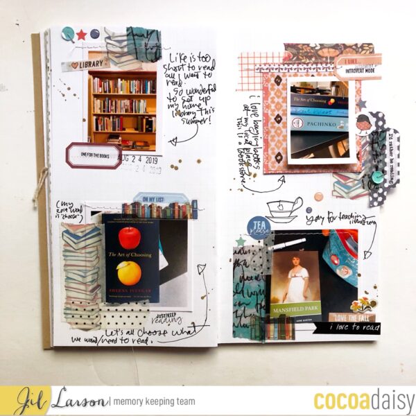 Hello everyone, Jil here today to share a page in my Cocoa Daisy Travelers Notebook. I’m using the Book Club kit, and featuring both the fall floral washi tape and that amazing big book washi. A grid design is my go-to, and it works great for multiple photo spreads.