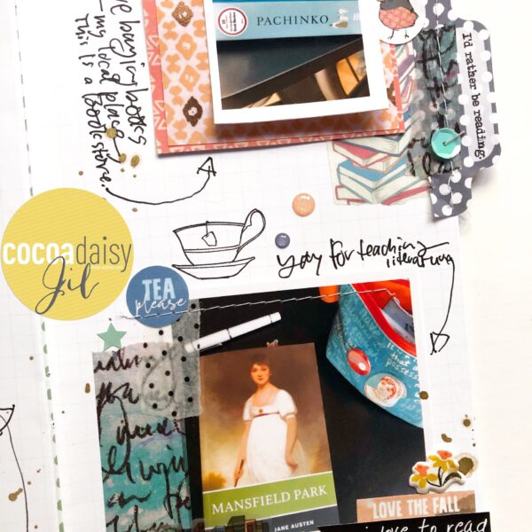 To pop over to the right side of the spread for a close-up, you can see that here I include little stories about my love for our local bookstore and my excitement about fall and my return to literature teaching after a refreshing summer. I used more stickers and stamps from the kit as well as a tab for the side of the page with “I’d rather be reading” stamped on it. I love how well the tabs and stamps coordinate!