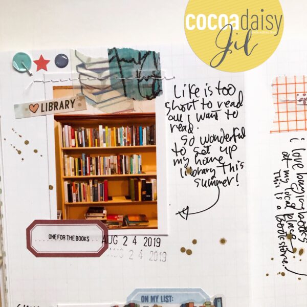 A big summer project for me was setting up my home library. One of the stickers from the kits was perfect here. I also used a bit of the book tape here at the top of the grid. If my page has a title, it’s One For the Books–part of my date stamp but fitting!