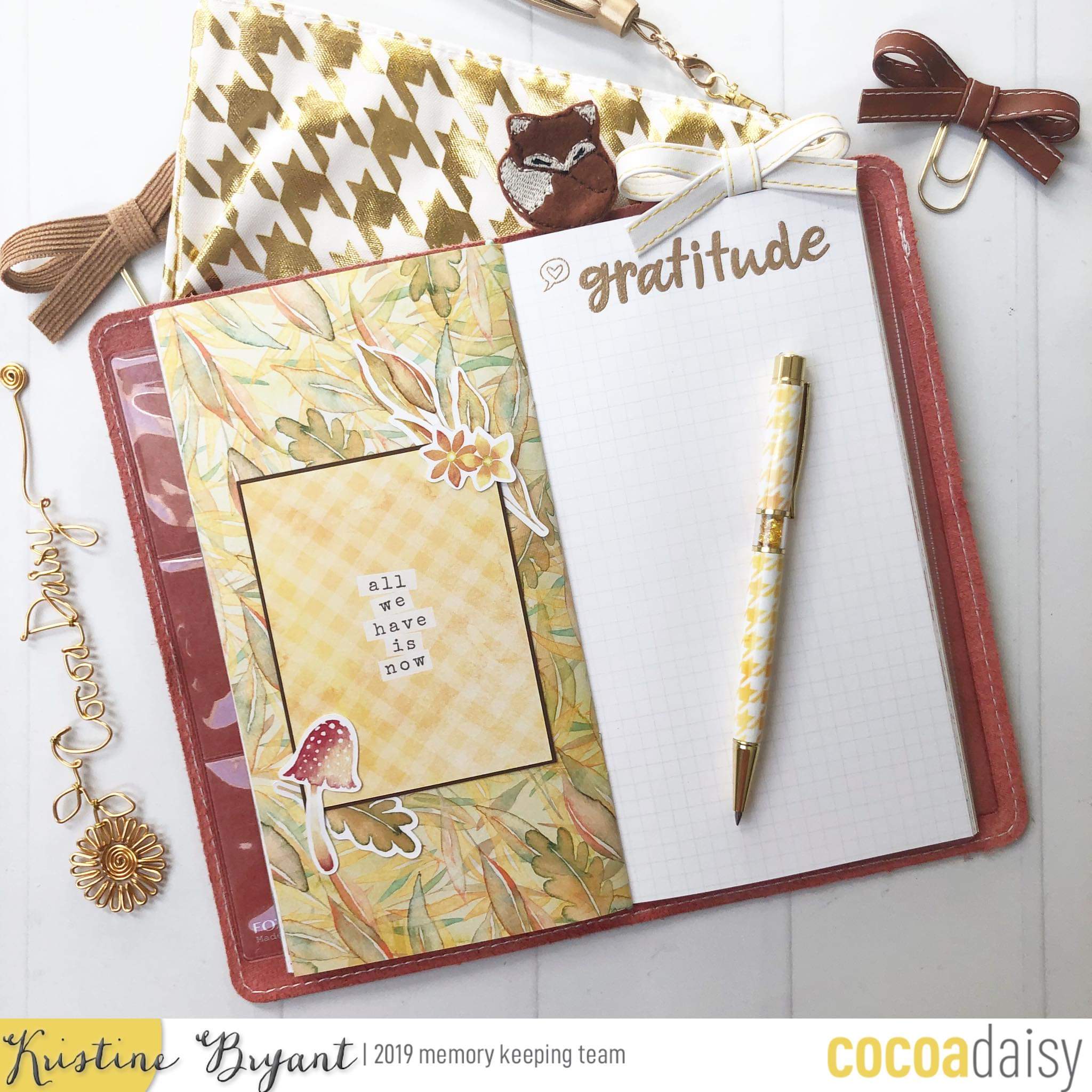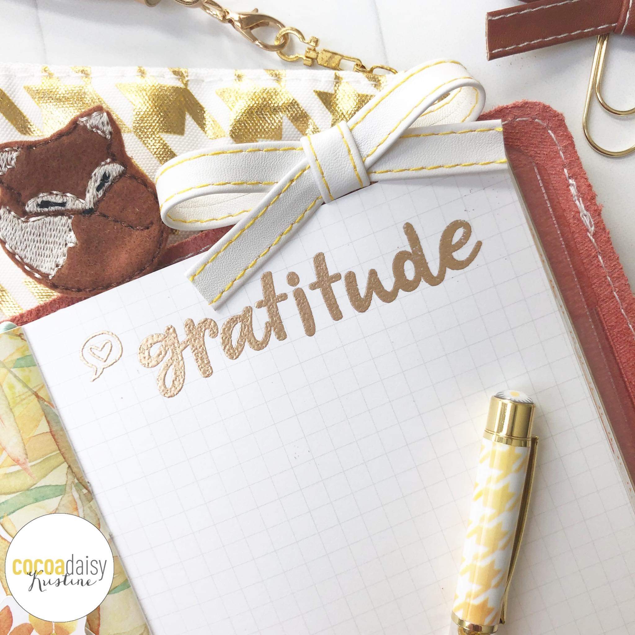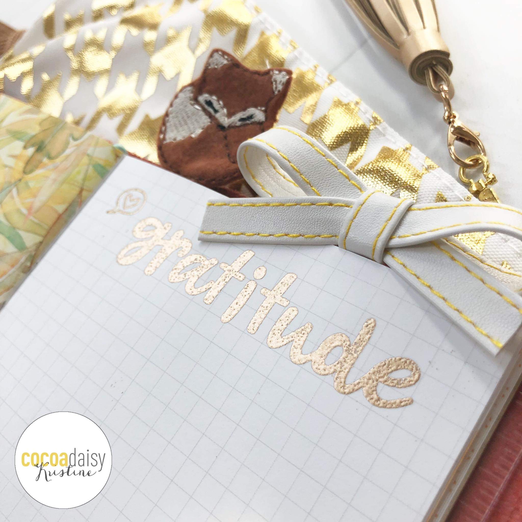 One of the first things I do in my new Simple Dori each month is set up my gratitude pages.I was so excited to use the alphas stamps this time ,and thought it would be fun to emboss them in gold to complement the opposite page’s art and really get into the fall state of mind. It was so ,so easy to do and really adds a pop to this otherwise simple layout.💛