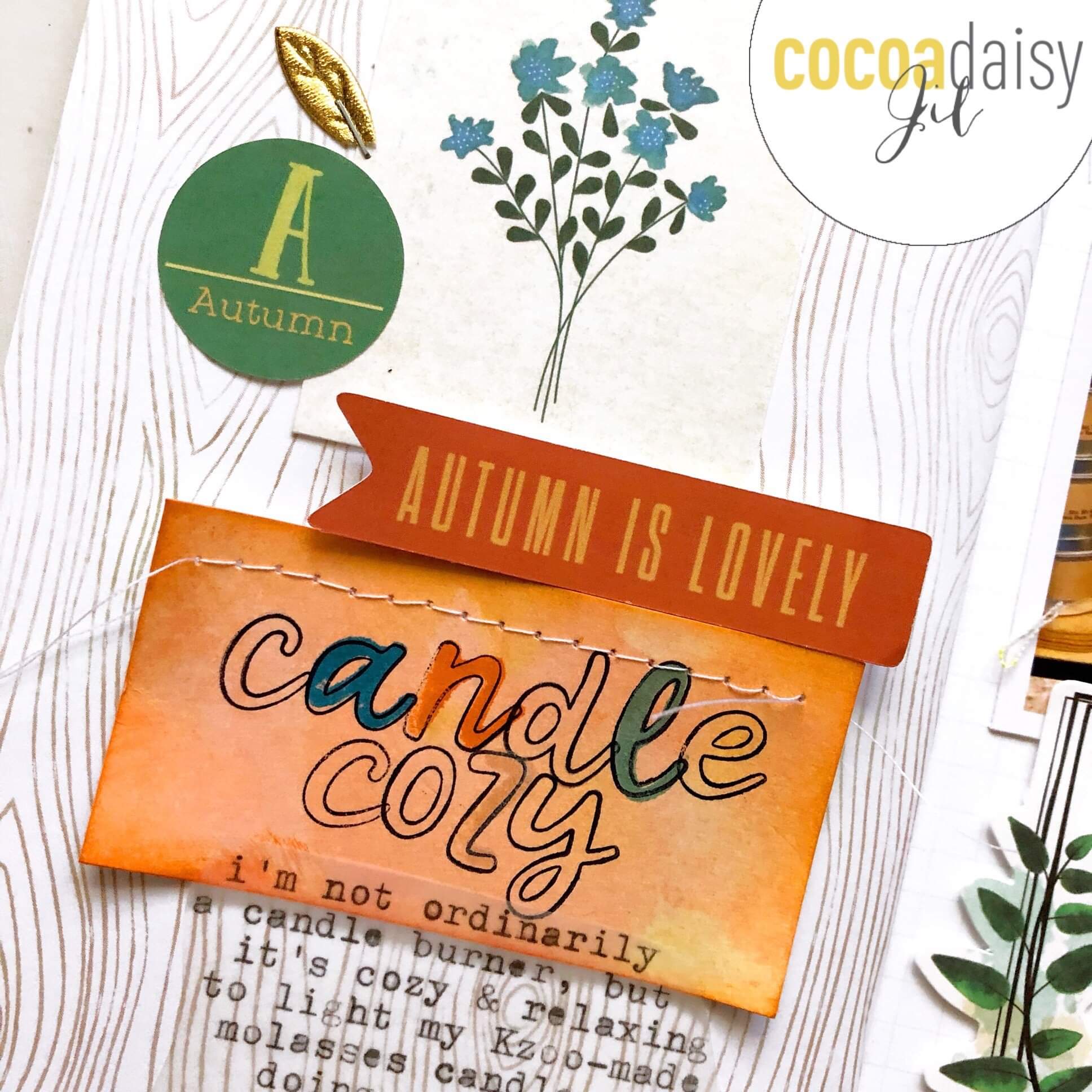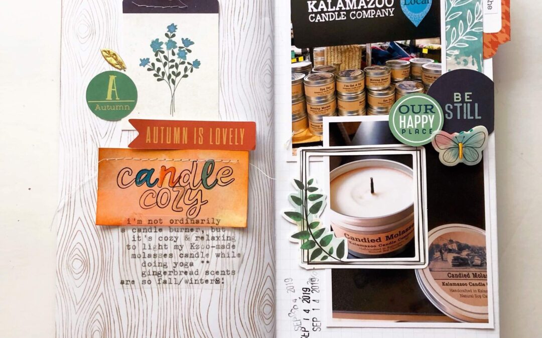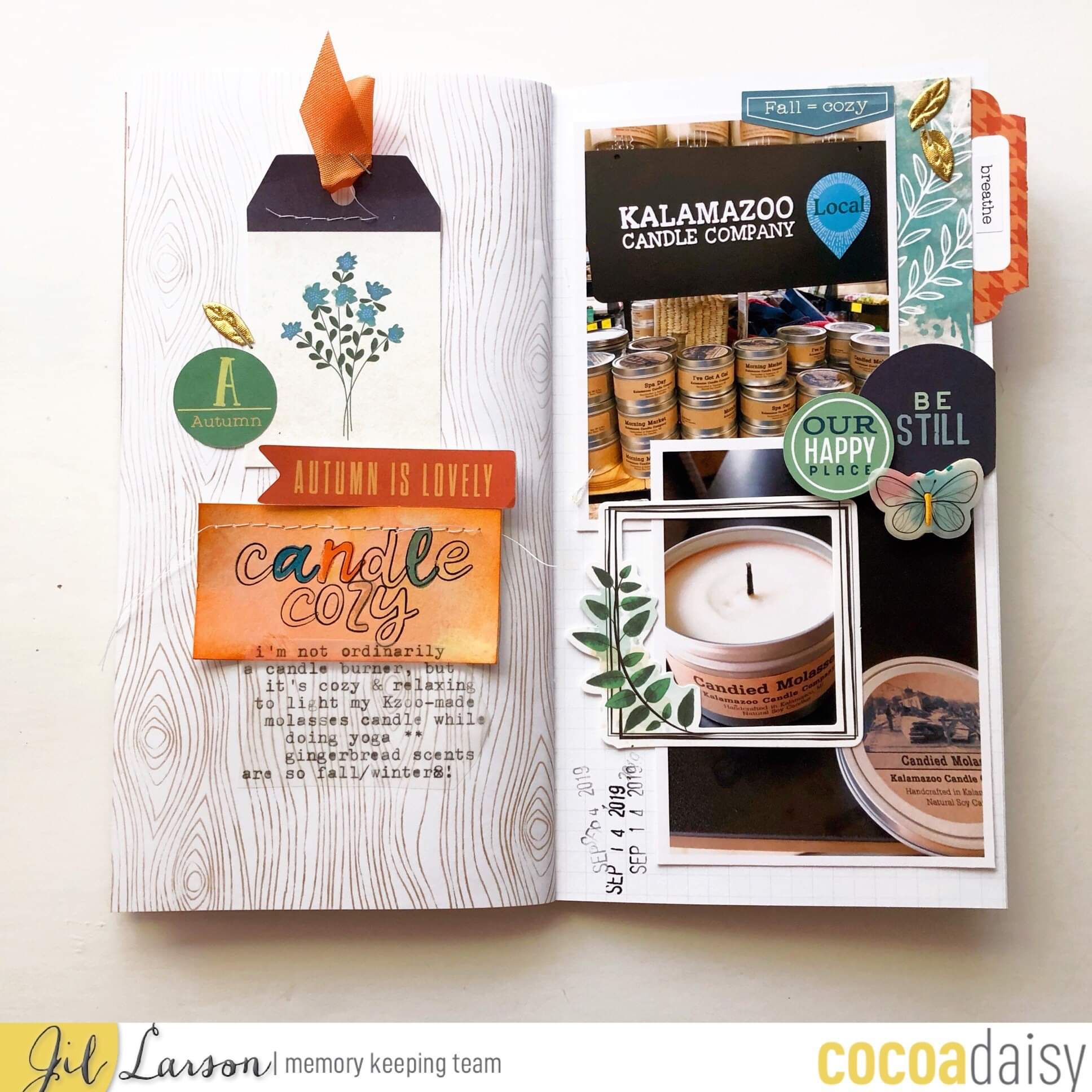 I used the woodgrain page in the Traveler’s Notebook for this spread about my new candied molasses candle. I stamped my title on pumpkin-y orange paper I made with distress in,a good match for the orange of the die cuts and tab . Pulled in a little orange seam binding for my tag.