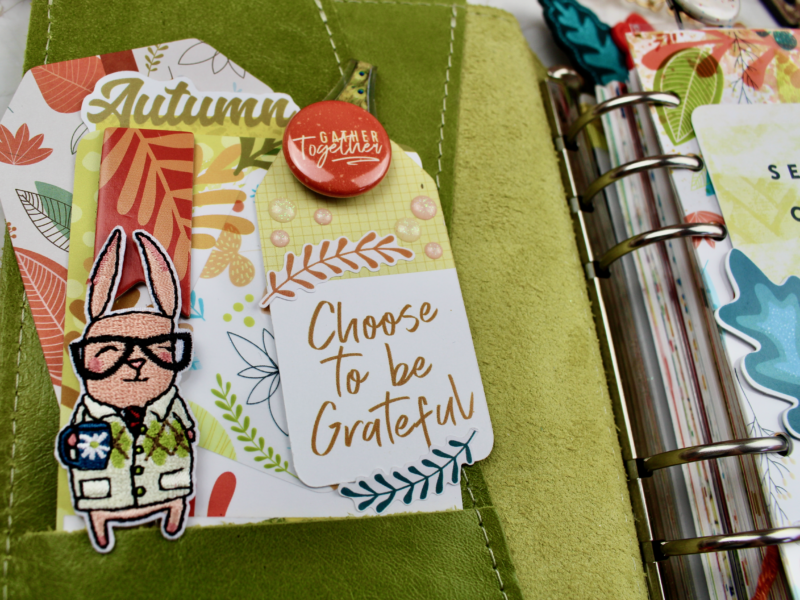 I wanted to focus on the theme of ‘gratitude’ throughout my planner – right from the very start with this pocket decoration, using tags, stickers and die cuts.