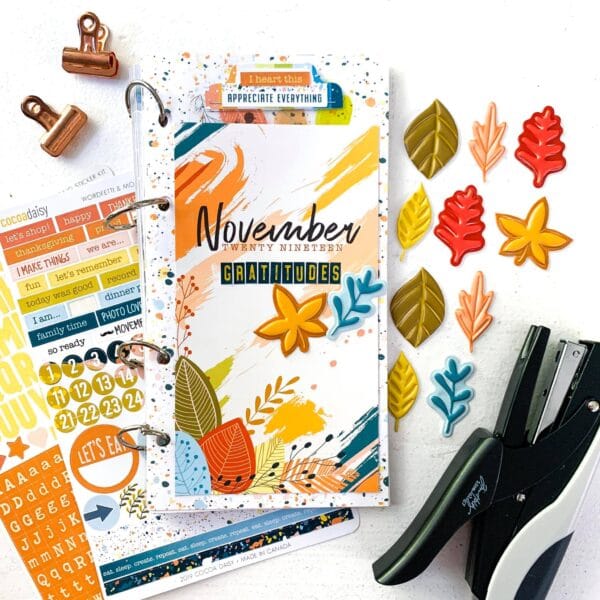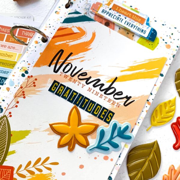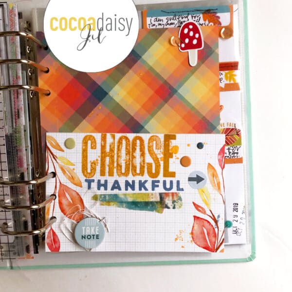 The Memphis Season kit is brimming with great elements for documenting gratitude in notebook, planner, or scrapbook. I used elements from the kit for a section about gratitude in my One Little Word album. My word for 2019 is “choose,” and so I focused on theme of Choose Thankful in the October section of my album: