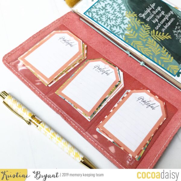 Here’s what Kristine says about her approach: “I’ve decided to up my daily gratitude game for November! Instead of just a daily list of sentences, I am making use of the sticky notes that came in the Pocket Memory Keeping Kit. I removed each one from the pad, and with a glue stick, attached them to the papers from the MK and planner kits. I cut them out leaving a small border, which gives the stickies a little pop. My plan is to write something I’m grateful for one one sticky per day, and then adhere those into my simple Dori, starting on the Gratitude page shown. I also am going to leave some room for extra journaling, if the mood strikes. The notebook cover I’m using has a vinyl pocket adhered to the front, which is the perfect spot to store two weeks’ worth of stickies – this way I can easily take them with me and add my gratitude on the go if I want. I’m excited to see how the whole thing looks at the end of the month!”