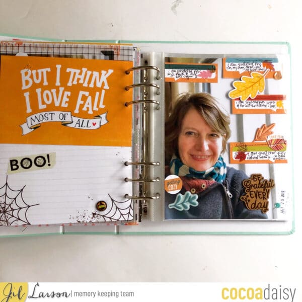 Since this is in my October section, I had to have a card to write about Halloween, even though my focus, and the journaling I’ve already done, emphasizes what I’m thankful for. I love add tags and pocket cards from the Cocoa Daisy kits in my OLW album!