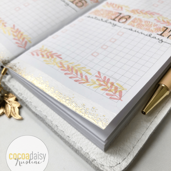 My planner pages are divided into 4 sections on each page, and each section has an open header at the top. I thought this would be the perfect place for a pattern, so I used the small leaf pattern stamp from the TN Memory Keeping kit to fill in those headers. I used washi tape to section the headers off so I wouldn’t get ink where I didn’t want it, and it worked perfectly! I initially stamped the rose color, and then decided to add a second layer in gold – since it’s so pale, the pink is still clearly visible, so the pattern isn’t muddled, but the second color adds a bit of dimension and depth that I love. From different angles, the two together almost look peachy-orange, which was a fun surprise that I didn’t expect but totally love!