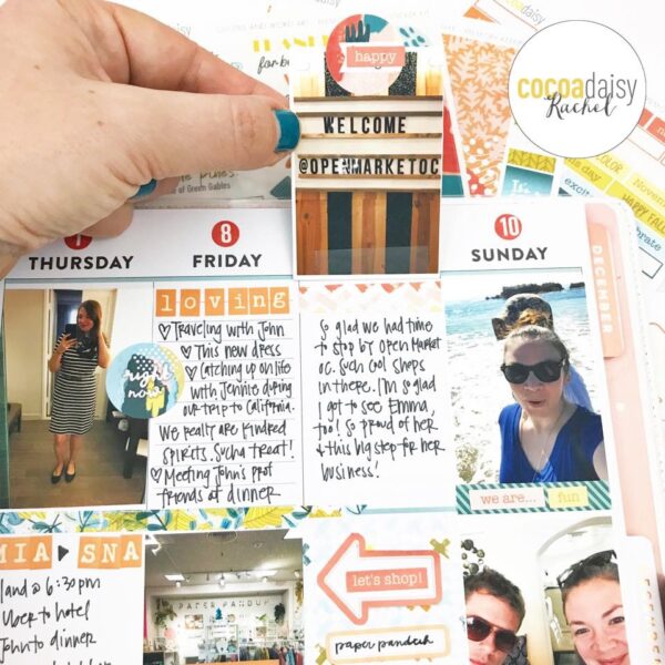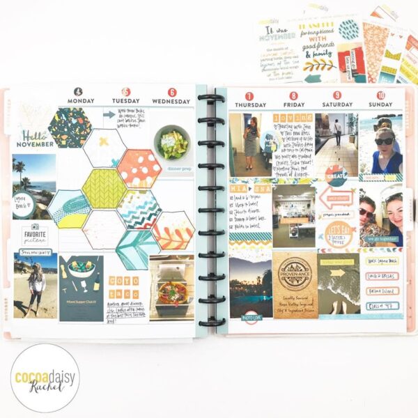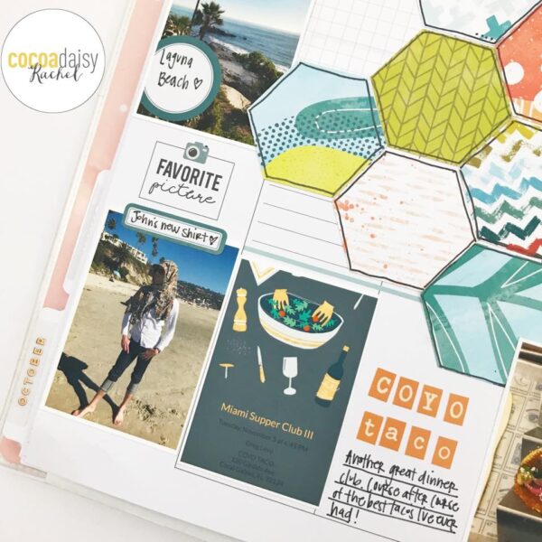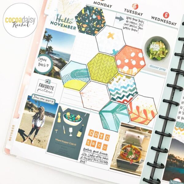 “I didn’t have many photos at the beginning of the week, so I punched a few hexagons from the kit papers (and the MK Sticker Kit) to fill the beginning of the week. I love all the vibrant colors together – definitely matches my eclectic documenting style. This is a great tip for those weeks you just don’t have much going on. Just an excuse to fill the page with pretty decoration!”
