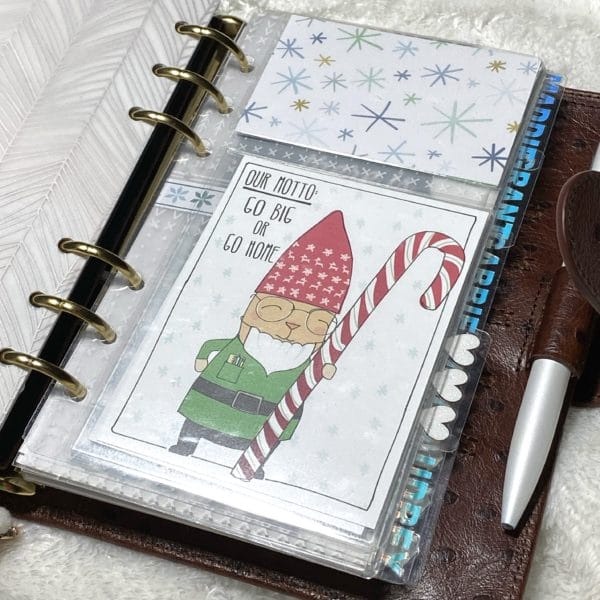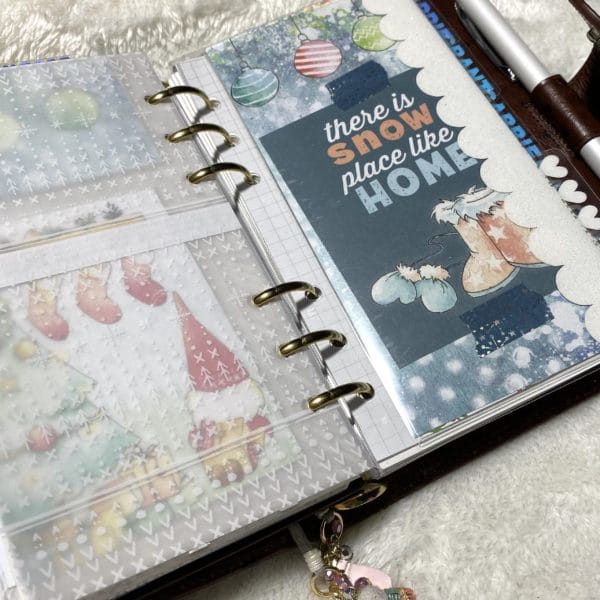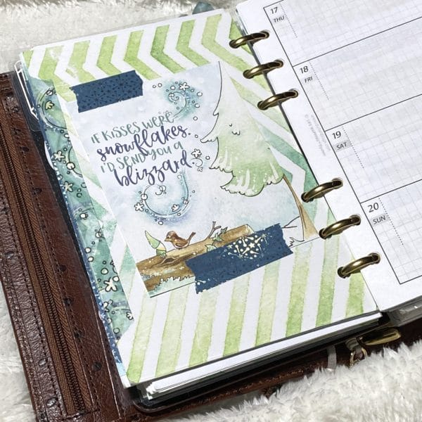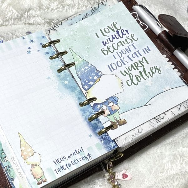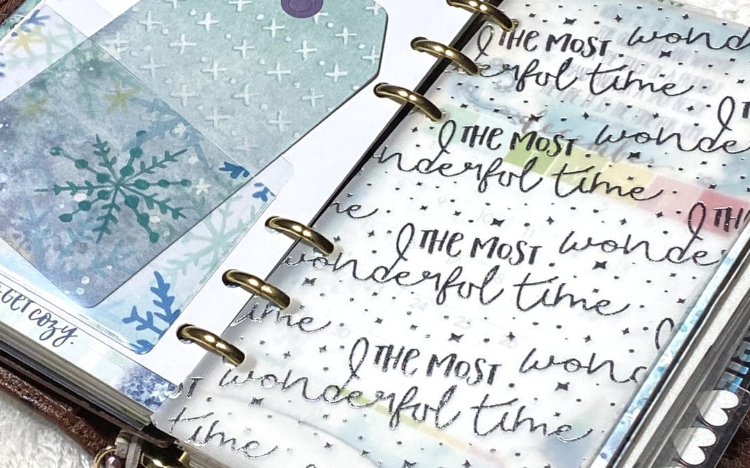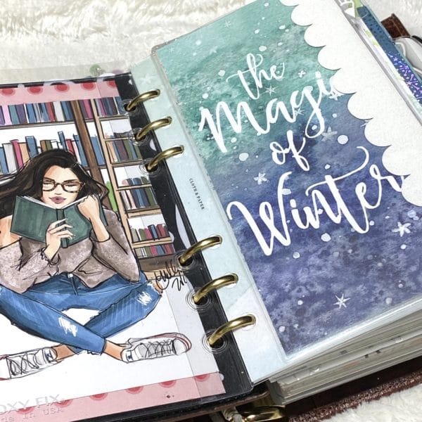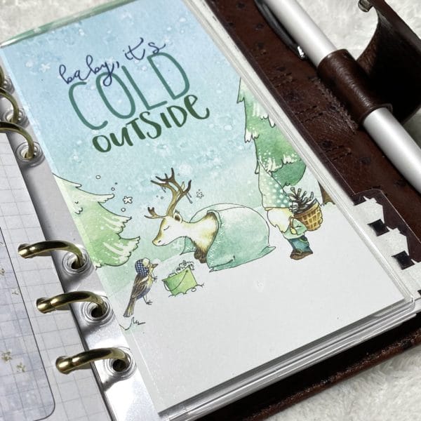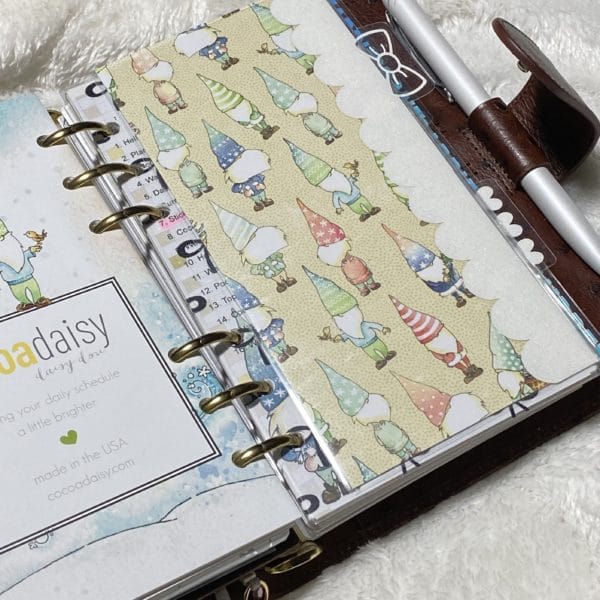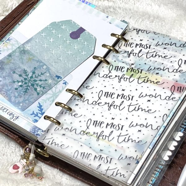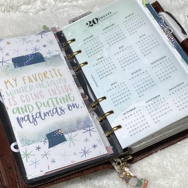 The backside of my first divider is decorated with one of my favorite pocket cards from the kit! I have to be honest though – this is a favorite year round activity of mine, and not just a favorite winter activity! Haha! Opposite the card I have a 2020 overview printed on thick vellum. I layered one of the Cocoa Daisy papers behind it to make the design pop!