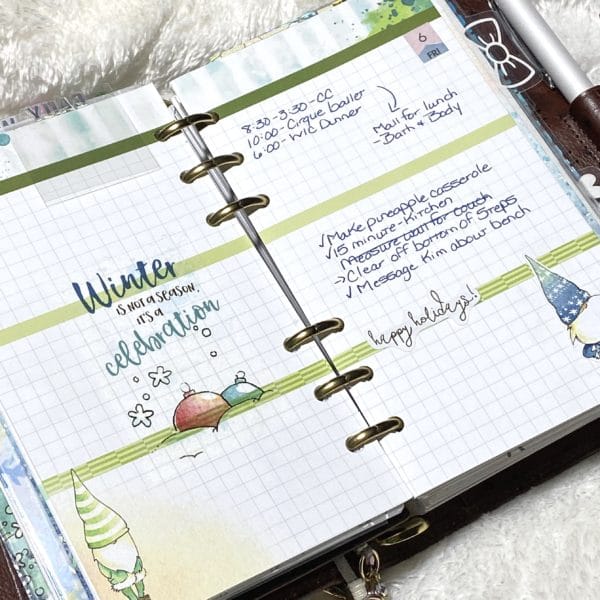 Diving into my setup: is anyone surprised that I’m in a different planner (and I believe a totally different size from the last time I shared a setup)? No? I didn’t think so. I am back to personal rings, and this time I’m using a Gillio Compagna. I chose this planner because it has all of the things I’m currently needing in a planner. Personal size. Smaller rings. Pen loop. Snap closure. Big back pocket for papers. As always, I can’t guarantee that I will stay in this planner, but I’ll be honest. I really want to try. Planner needs evolve, so planner needs change, so changing up a planner to meet your current needs is an extremely logical thing to do. But like I’ve talked about before, I was losing some of the functionality of my planner by the constant switching. That had more to do with the fact that I was switching between sizes and styles of planners as well. So my goal for 2020 is to stay in this personal gillio, and to just my gorgeous Cocoa Daisy kits to jazz it up and keep it fresh every month!