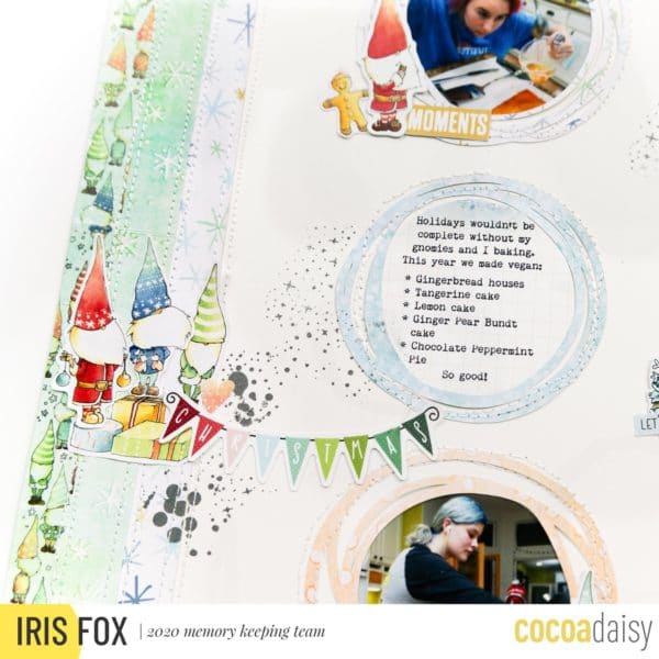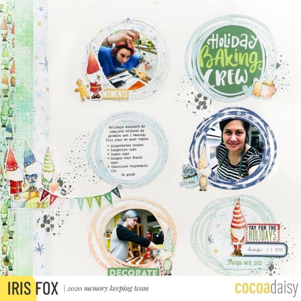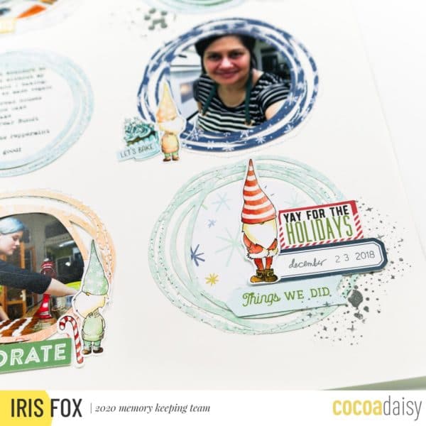 “I’ve been obsessed with gnomes for a couple of years now, so I was delighted to see the December “Nordic Woods” kits are all about gnomes! I decided to document the photos from our holiday baking last year. I used the Messy Circles cut file from my shop to cut a bunch out of the patterned papers that came in the Memory Keeping Pocket Kit and the Main Planner Kit. I printed my photos as 2.5” squares, knowing I could use a circle punch from my stash. I wanted to use the “Holiday Baking Crew” pocket card as a title within one of my messy circle frames, so I made a 3” circle in my Silhouette to cut it out. That’s one of my tips for scrappers: don’t forget your digital cutting machine isn’t just for paper, you can also use it to crop photos!”