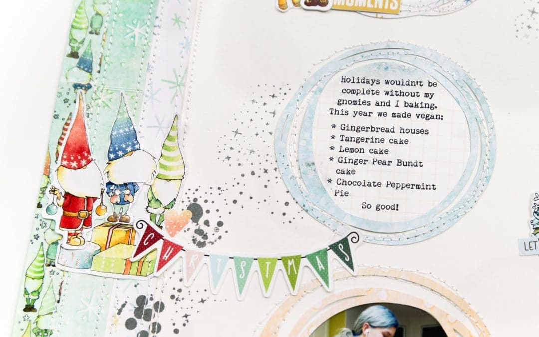 “I also added smaller clusters of die-cuts and stickers to each frame, making sure to sprinkle gnomes around. About 2/3rds of the way down the page along the paper strips side, I have a grouping of three gnomes (think three wise men). They are anchored to the design by a sticker of presents serving as a podium of sorts, and connecting to the circle side of the design by the ‘Christmas’ banner from the Christmas Planner Kit.”