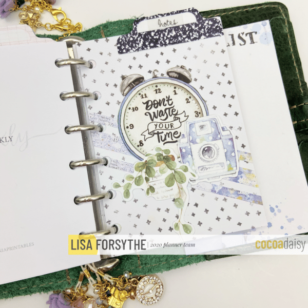 Last but not least is my notes section. I cut my mini dori down to pocket plus size for this. I love the artwork in the dori and love to reflect on my notes, whether it be church notes, quotes, affirmations etc. I cut out the clock artwork from one of the personal dashboards to make it work with my color scheme. I dded a couple of die cuts and glued those to one of the papers I cut down and embellished with paper stripes. Love ow this one turned out as well!