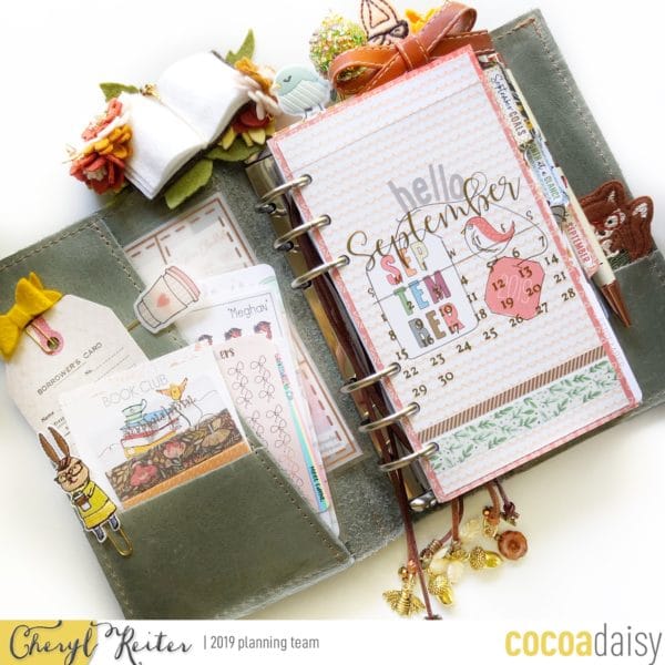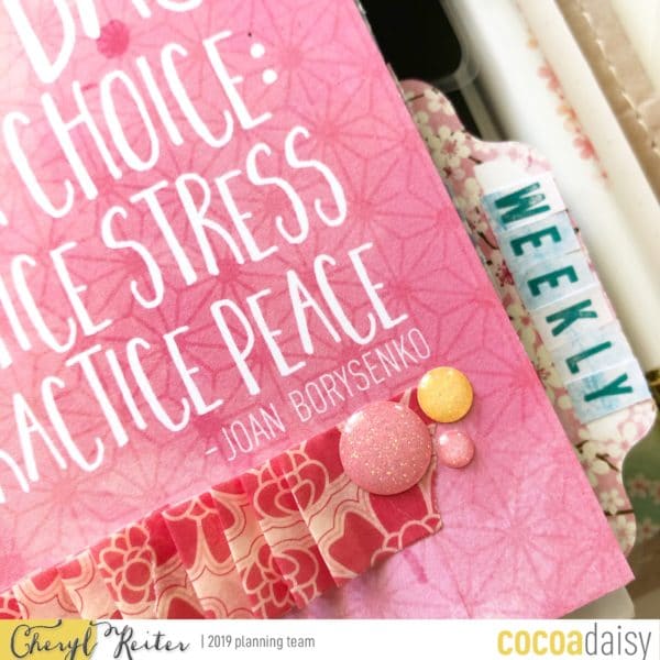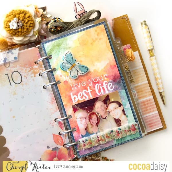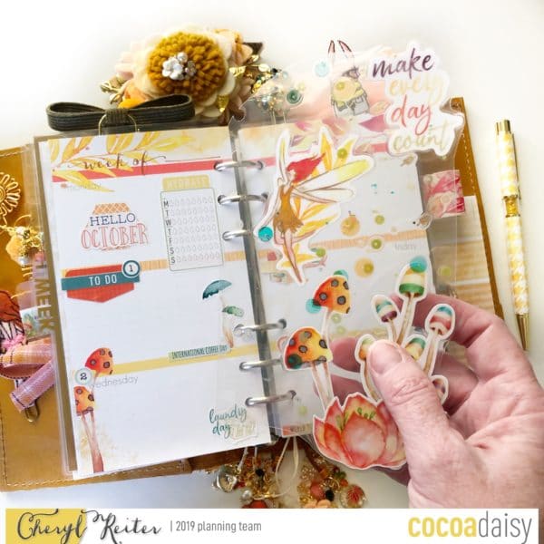 After the more neutral colors of September, October brought us these warm vibrant colors that just sung to me! The watercolor papers with the all the colors of the rainbow were the perfect frame for my family (a photo that I love to keep in every planner). I used the fairy and mushroom die cuts to make another clear laminated page marker. The whimsy of the art was such a change from the previous months but so enjoyable – it was really a take on the “leaves” falling from the trees something I truly enjoy here in Virginia.