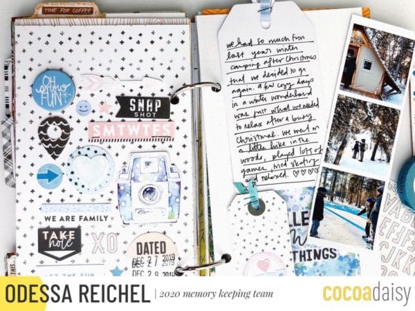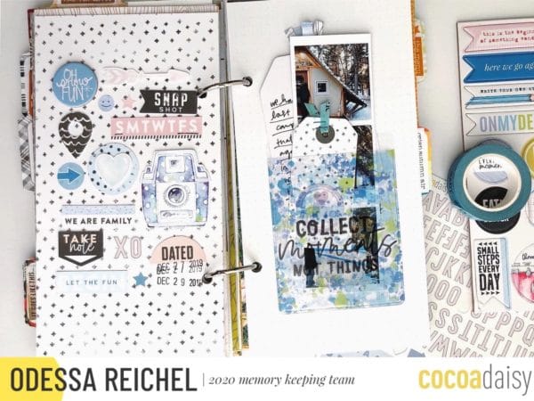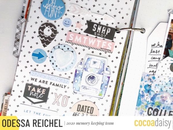 “I added in a couple of tags; a smaller one with some stickers and the big camera one with some journaling on it. I used some washi and washi strip stickers folded in half to make some coordinating “ribbon” to string through the holes in the tags.”