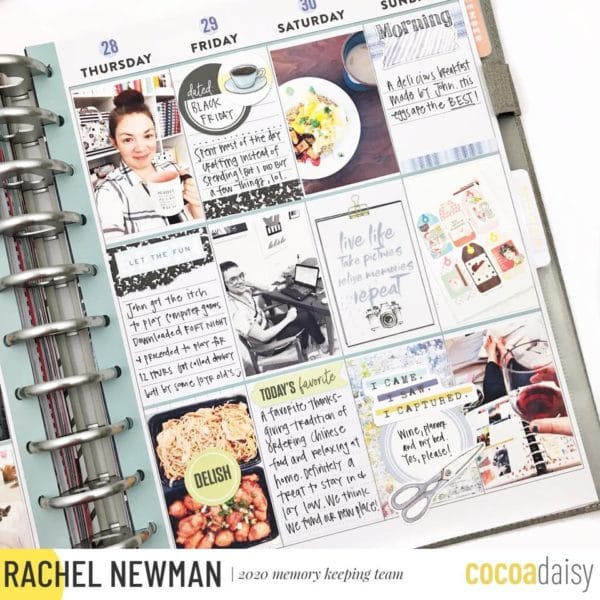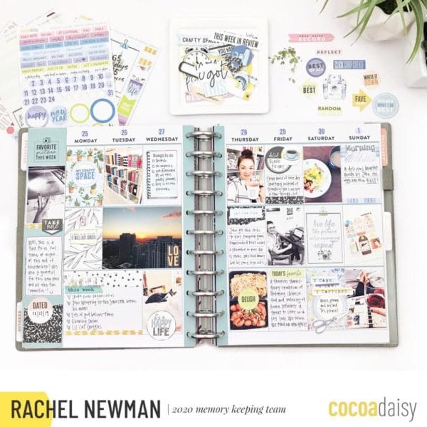 “Hello, Memory Keepers! Rachel here, and I am sharing a memory planner spread featuring stickers from the Memory Keeping Sticker Kit and die cuts from the Pocket and Travelers Notebook Memory Keeping Kits. I am using a Big Happy Planner to document my weekly happenings. I don’t tend to stick to the daily columns assigned. Instead, I look at the week as a whole and build my layout from there. I like to design the spreads as I would a 9×12 (left side) and 12×12 (right side) pocket page layout.”