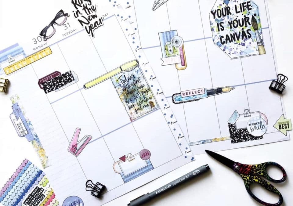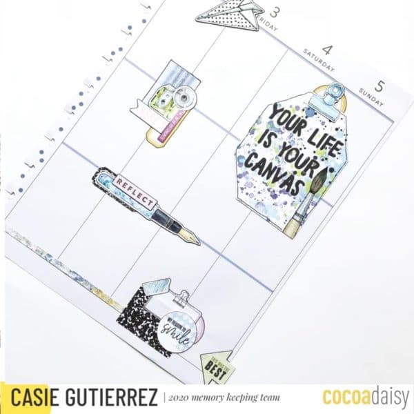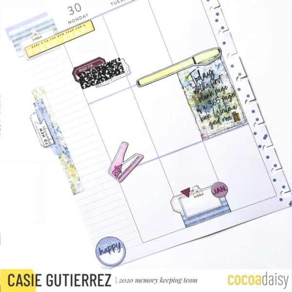 “Layers upon layers of stickers and die cuts to kick of a new year of memory planning! I love how the die cuts from this month’s kit highlight every day documenting tools like pens, clips and the occasional paper airplane.”