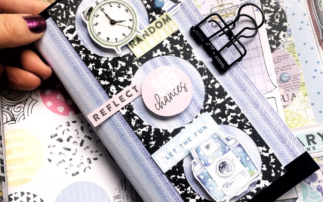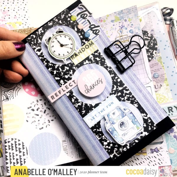 My last cover uses the negative space from the paper that I had punched the circles from. I flipped it over and used the composition book pattern for this cover. I used a strip with three punched circles. This was adhered to  a strip of patterned paper which I trimmed to fit my Daisy Weeks insert. Then, I layered some of my favorite die cuts onto it. The enamel dots at the top finished it off.