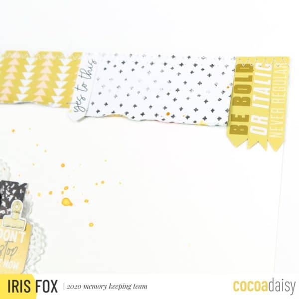 “Speaking of the top, it looked too plain after the bottom clustering, so on a whim I added the “yes to this” die cut flag. I liked the look so much, I searched for more flags to add, but I wanted to alternate to yellow and there weren’t any. Instead, I cut up one of the cards from the Memory Keeping Pocket kit to create the three yellow flags I placed at the end of the border. I also stitched across the top edge in the same zig zag pattern and added tiny staples in two more spots on the layout. They are a tiny detail, but help your eye flow across the page.”
