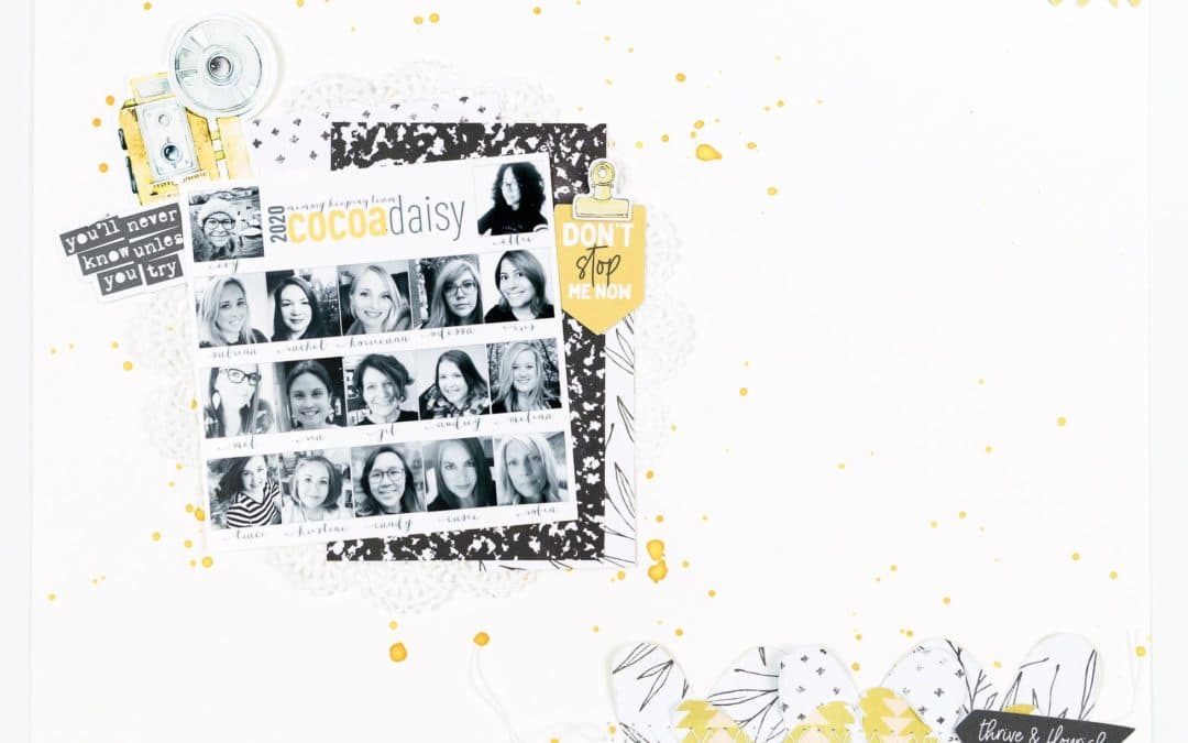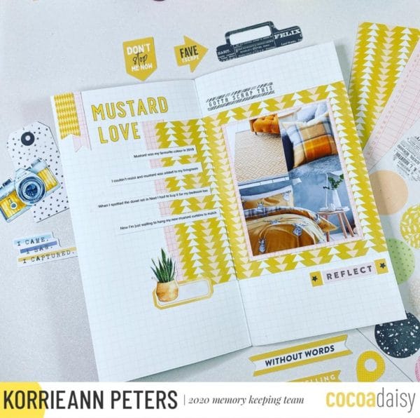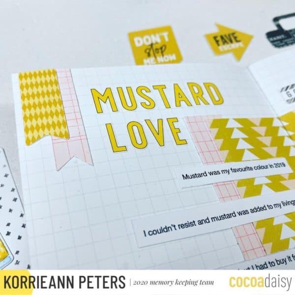 “When I sat down to feature mustard in my scrapbooking, I thought what better to document than making the Cocoa Daisy Memory Keeping team? Love getting that yellow dotted little box of happy every month!”