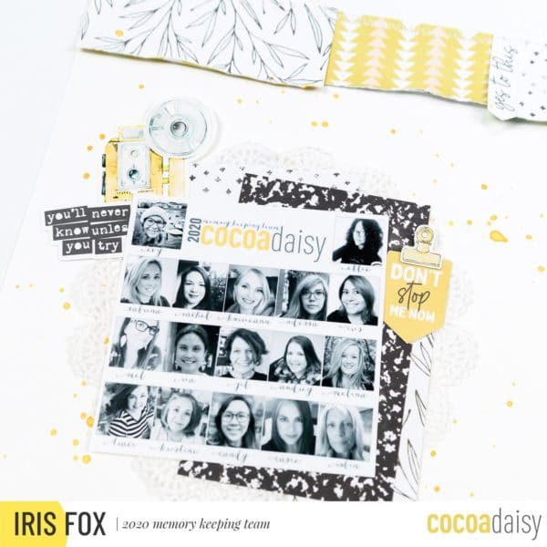 “I backed the team photo with more rectangles of paper, choosing to fan them out asymmetrically for more interest, and added a doily from my stash to add soft texture. Because the photo is very busy, I kept the embellishing around it simple. I added the “don’t stop me now” banner piece right next to my photo to emphasize it. Normally I like to anchor banner pieces with a staple, but as soon as I saw the little yellow clip in the Memory Keeping Sticker kit, I knew it would be perfect on top of it. I printed the subscriber printables so that I could fussy cut the yellow camera for the other side of the photo, and added it along with a word die cut.”