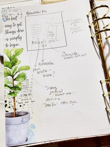 “Hello beautiful friends. What better way to welcome in 2020 then to do a “Dear Beautiful You” letter to yourself? I did mine in a 12×12 traditional layout. I always start my layouts with a loose sketch of my end design. Looking at my sketch, you will see I changed it up a bit in my final layout, but kept the essential design.