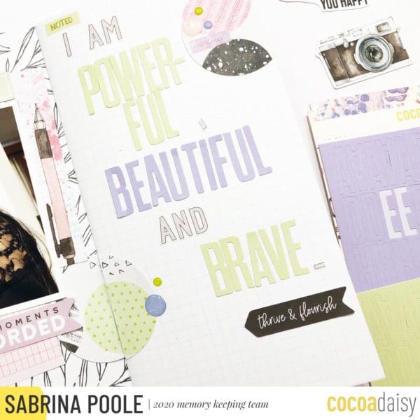 Sabrina is sharing her Travelers Notebook layout. “For this assignment the theme was “beautiful you” so I knew I wanted incorporate a quote. I found a quote on Pinterest and decided to use the Noted alphabets on one side of the page to make the quote a focal part of my TN project.”