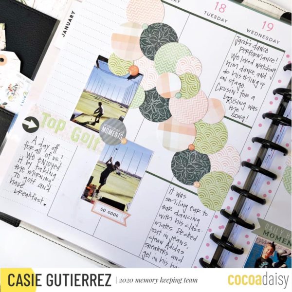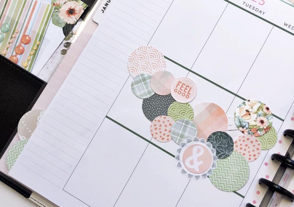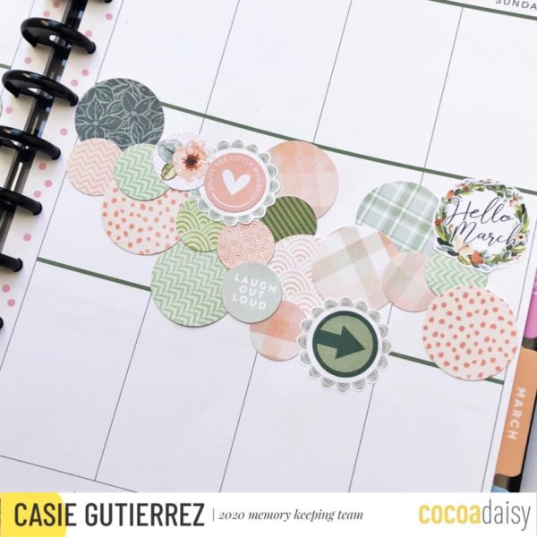 Now let’s see what Casie designed in her Happy Planner. “For this layout, I used repeating circles as a decorative element. I took a poll on Instagram, but as you can hear in the video, the cascading circle design won me over even before I checked all the votes. I love the way the circles appear to be falling down the pages.”