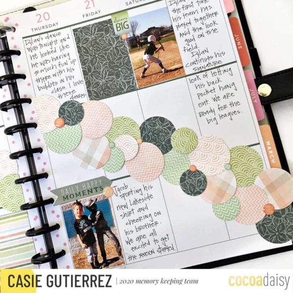 “I started with large circles and filled in the open spaces with smaller circles. I completed the design by adding the enamel dots for texture and sparkle. I like how the circles provide pops of color and allow enough room to document the memories and add photos.”
