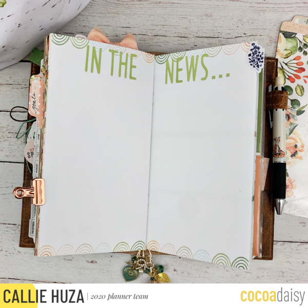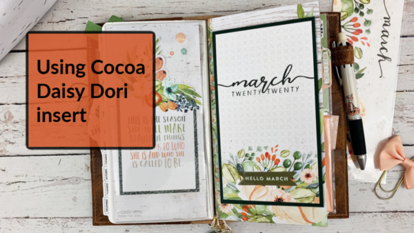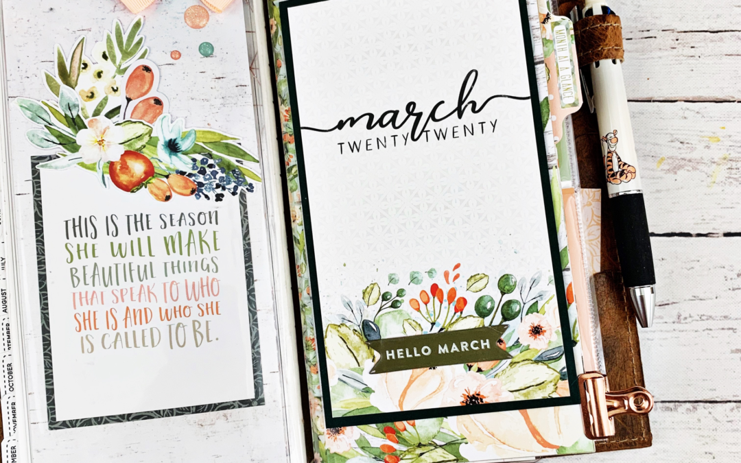 Have you been looking for ideas to use all the pages of your dori booklet? I have been, but I have finally decided on the things I want to keep in my pages that will help me be more productive and at the same time create a little memory capsule of the month. I thought about the things I would enjoy looking back on and I am going to give you a peek into my insert. I am using the standard size dori insert and this set up is from the March 2020 Orchard Path collection. Click here if you would like to shop the collection. As you can see from the photo above, I love to decorate the cover of the insert with some pattern paper and various bits from the kits. It serves as a gorgeous memory in a small book this way.