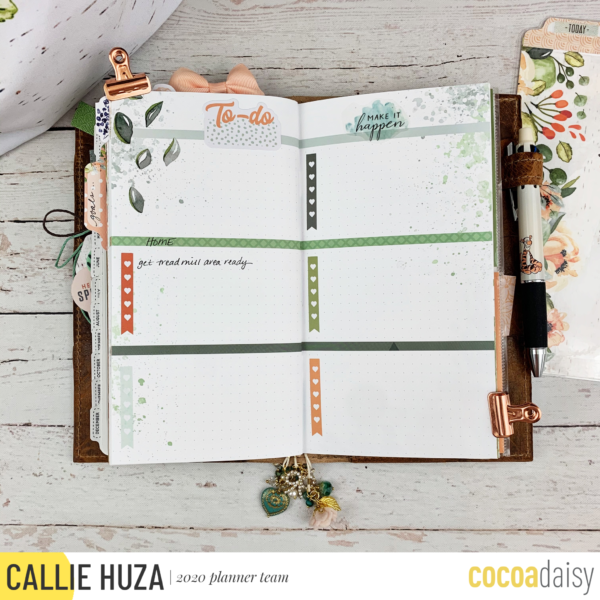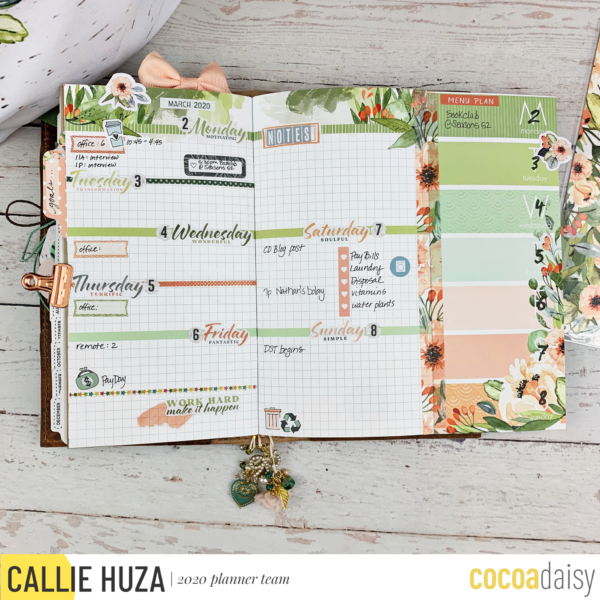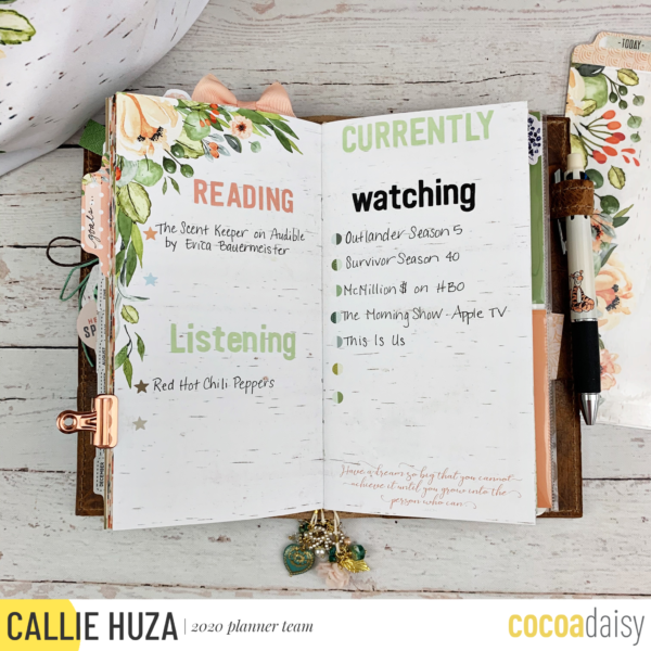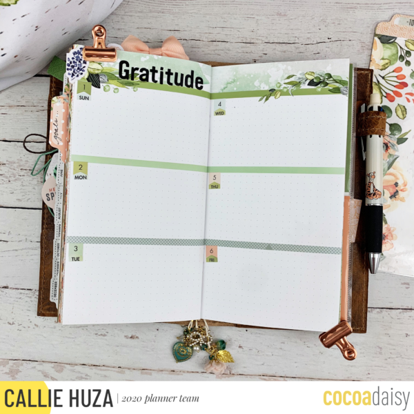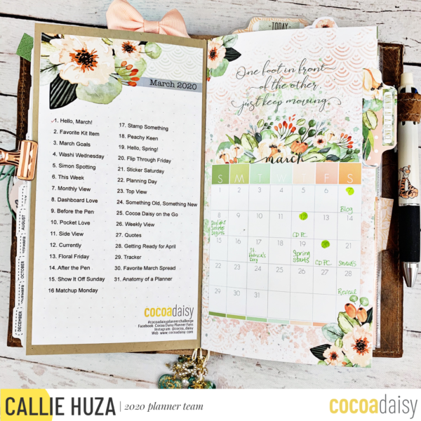 The first thing I include each month is a printout of the current planner challenge. I love to have it on the inside cover of my dori book so it is really easy for me to reference. I use the small month at a glance calendar to keep track of holidays and my design team commitments and of course, all the dates of the upcoming Cocoa Daisy reveals!