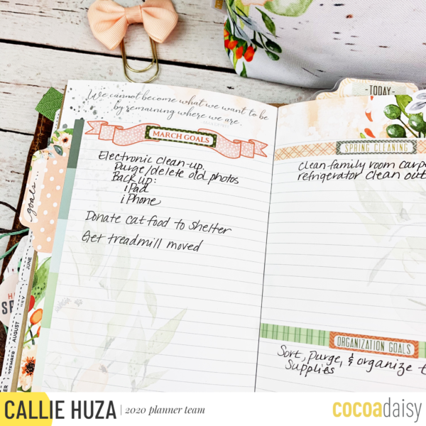 Next, I like to add my goals for the month. For March I have included some spring cleaning and organization that I want to get done; it’s that time of year! The banner stickers that came with the collection this month are so perfect to create a header on the page. I used some of the washi strips to split the right side of the page in half. I think it looks nice with a little something to ground the tab stickers on the page rather than just floating out there by themselves.