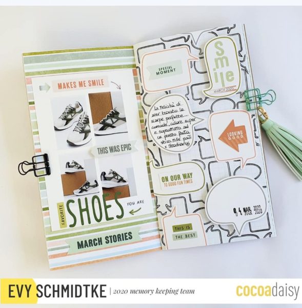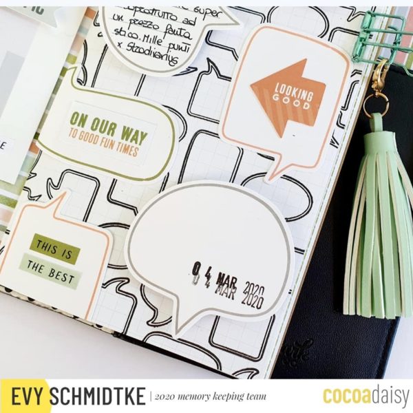 “On the right in the bubbles I stamped the date, wrote the caption and inserted some diecuts and stickers.”
