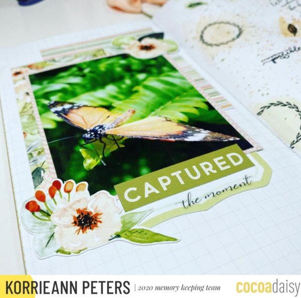 “For the left side I used a couple of the pocket cards from the Pocket Memory Keeping kit to layer my photo and the label die cut was perfect to pop out below my photo. I then added the flower die cuts to the corners and finished it off my title Captured the moment.”