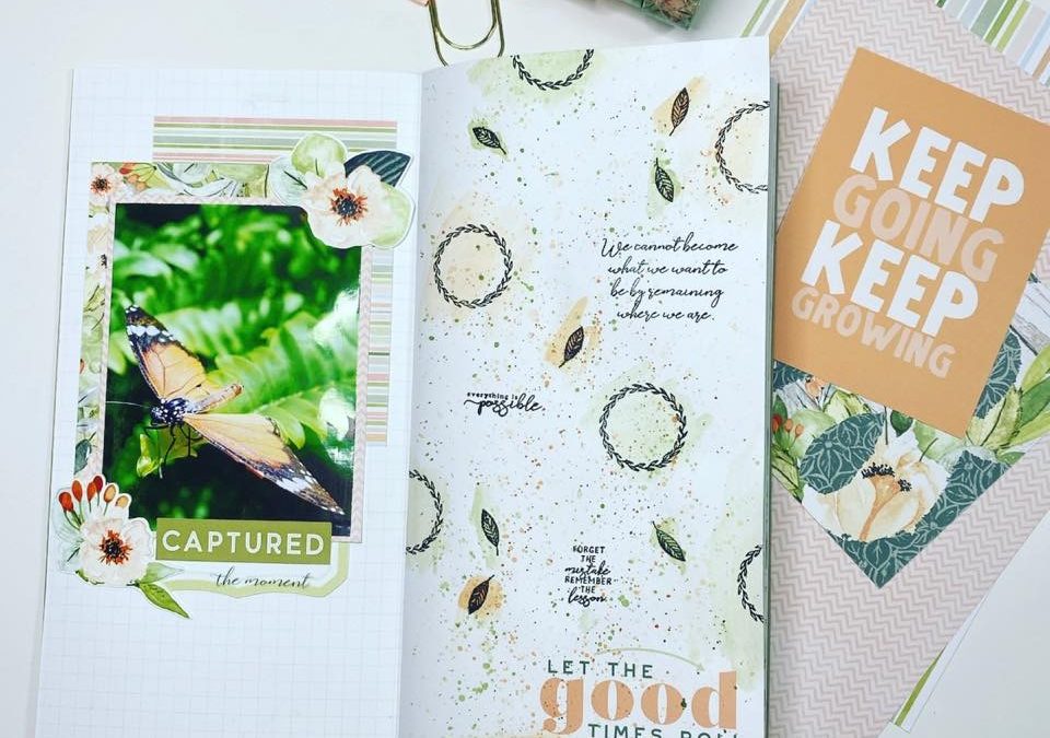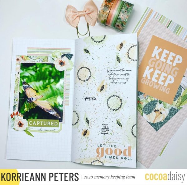 “There is a few blank pages in this month’s Simple Dori notebook which gave me the perfect reason to make my own background using the stamps from the Orchard Path Memory Keeping and Pocket kits.”