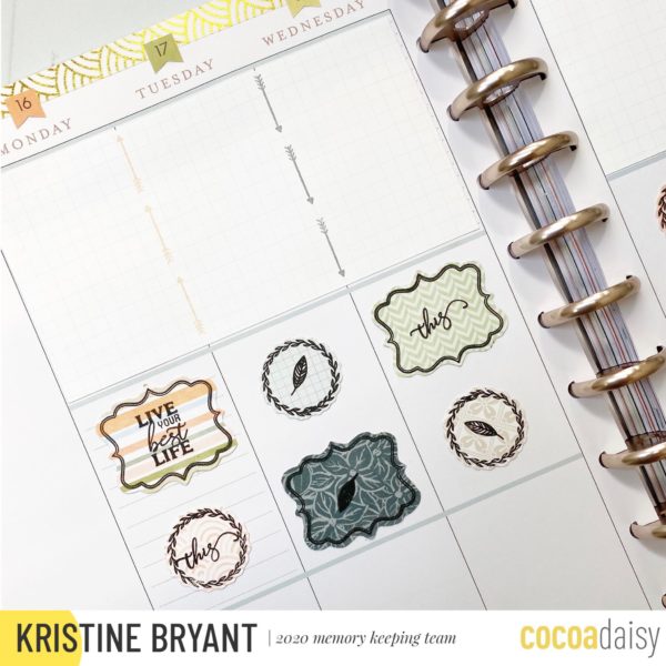 “I used bits of leftover papers from the memory keeping and planner kits, and used the word and leaf stamps (also in the stamp set) to fill them in.”