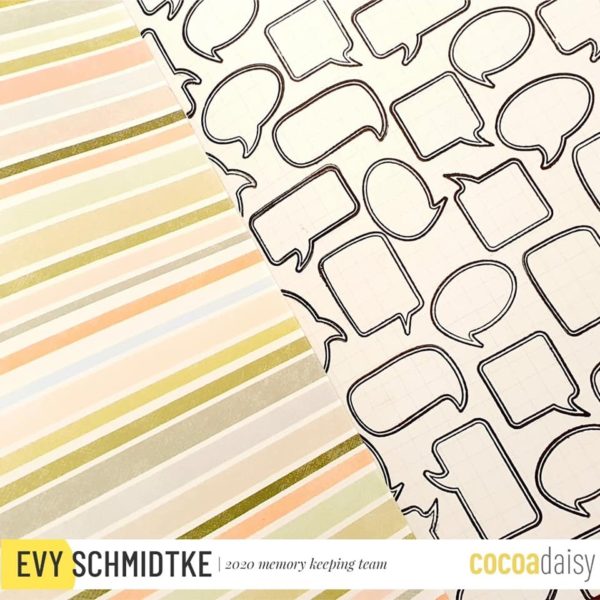 Evy’s pattern on pattern design is eye catching. Stamping her background with black ink allows the speech bubble die cuts to stand out. Our kit stamps provide endless possibilities for creating your own patterns and backgrounds just like the designs we have shared today.