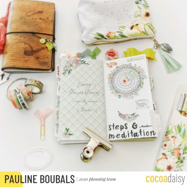 I like to use the “bubble style” for this page. This allows me to add some details, like how many words I wrote, or the theme of chapters. For doing this, I used again a simple dori template, and the bubble stamps from the stamps subscription. I used the same letters set for the title than in my “steps and meditation” page. I always use just one alphabet style each month, in order to have a regular pattern in my dori. Flowers on the right page are from the March free printables.