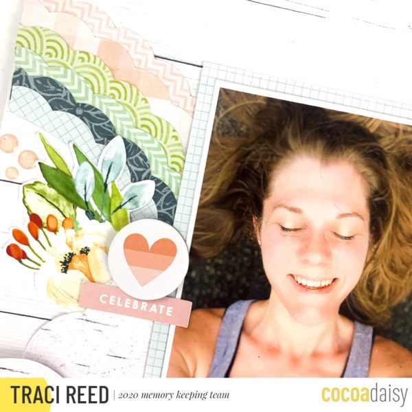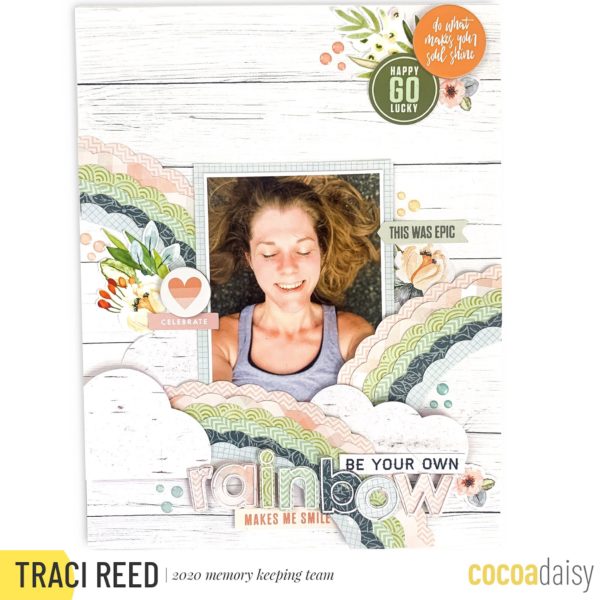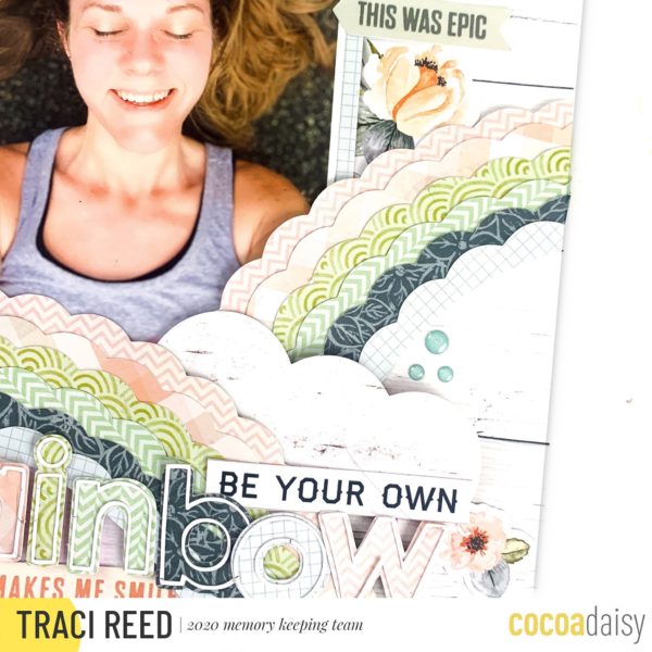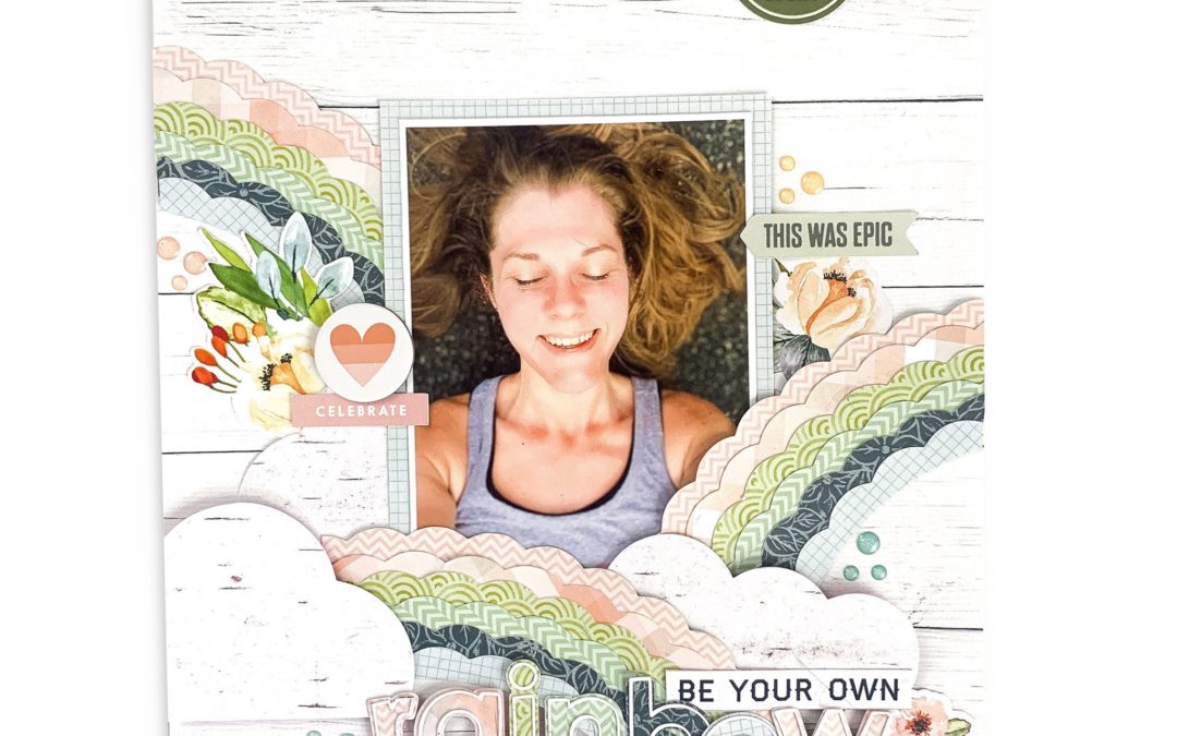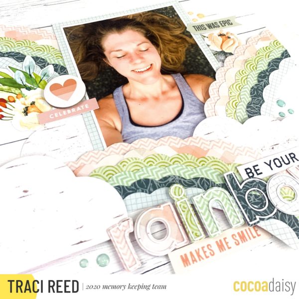 Our first design share is a gorgeous rainbow of color by Traci. “I fully embraced the rainbow with my layout, even including paper-pieced scalloped rainbows cut from a digital template!”