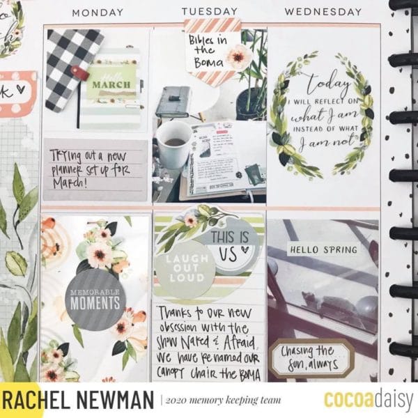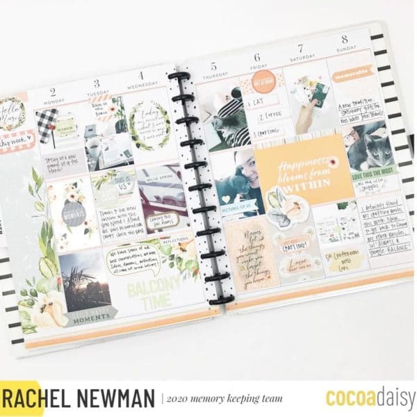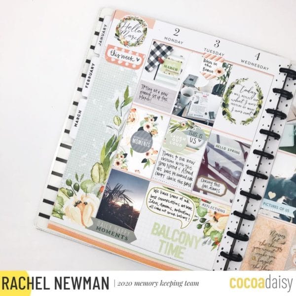 Next we have Rachel sharing a layout in her Big Happy Planner. ”I’m excited to share another memory planner spread with you today! I cannot get enough of the March Orchard Path kits and will likely use them on every spread this month!”