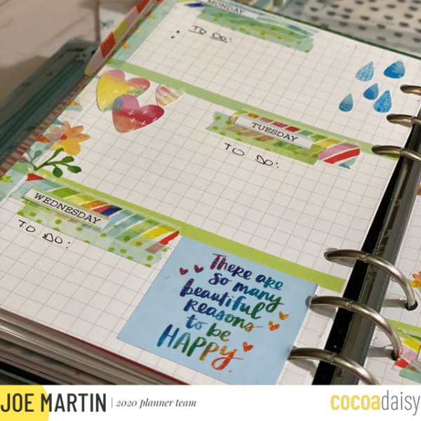 Today I am sharing my process for planning my week using stickers and washi from the Cocoa Daisy kits. I love the versatility of the stickers and the washi. If you would like, you can also follow along with my video listed here! I use the standard dori book cut down to 6.75 tall so that it is the size of the Franklin Covey compact insert. Even if you’re a ring bound planner, you can still use the dori books!